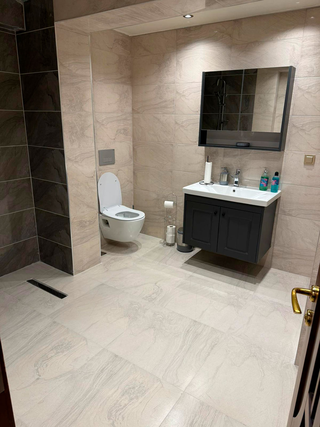 Nem dayanımlı aydınlatma, priz–anahtar ve aspiratör sistemlerini kuruyor; temizlik ve son kontrollerin ardından banyonuzu kullanıma hazır teslim ediyoruz.